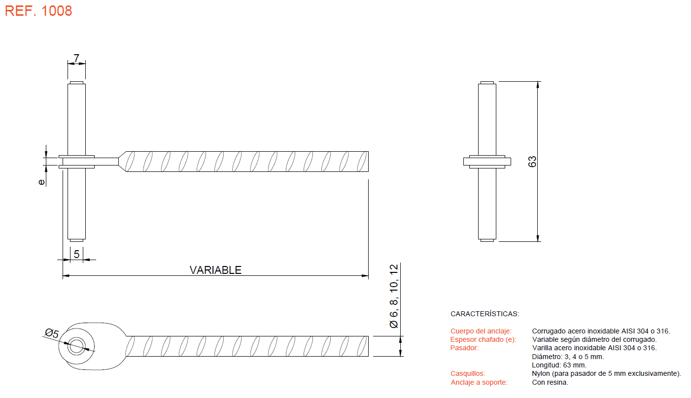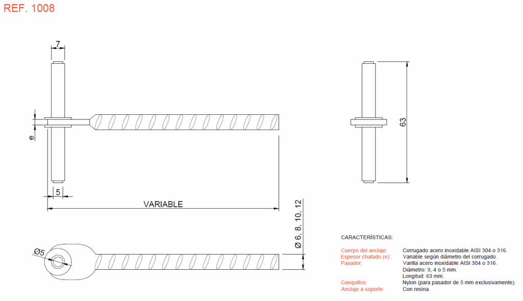 Puede fabricarse en acero inoxidable AISI 304, AISI 316 o dúplex 1.4362 y con varilla roscada en lugar de con corrugado.