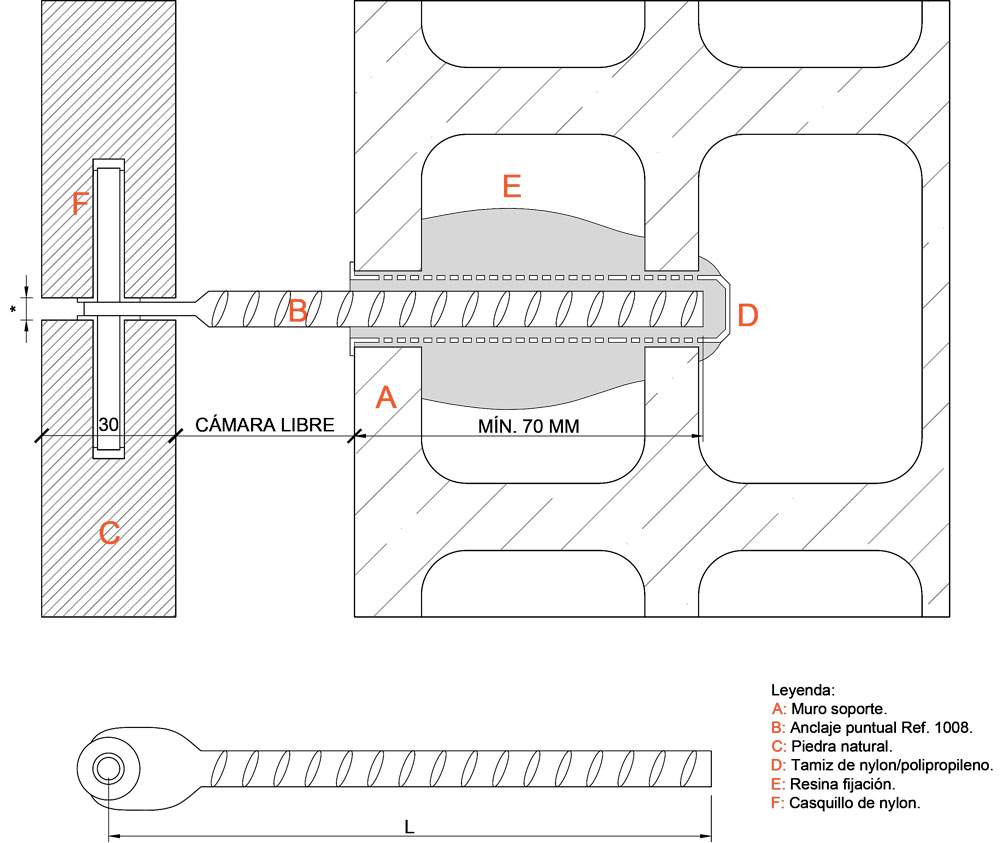 Sistema puntual de anclaje en acero inoxidable para piedra natural sustentada mediante pasador. La longitud y el diámetro del corrugado dependen del tamaño de la piedra y de la cámara necesaria.